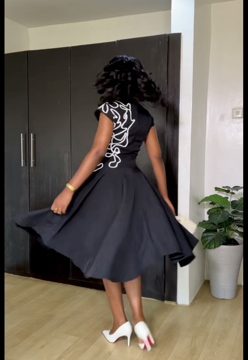 Artistic Tape embellishment on medium length flay gown, Designed for expressing art from elegant fashion