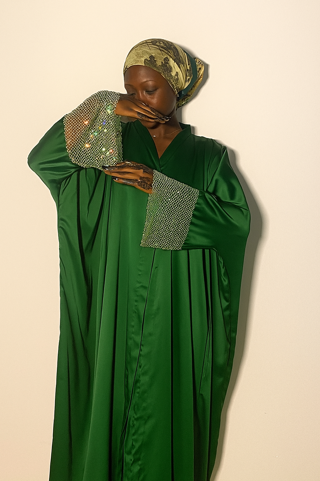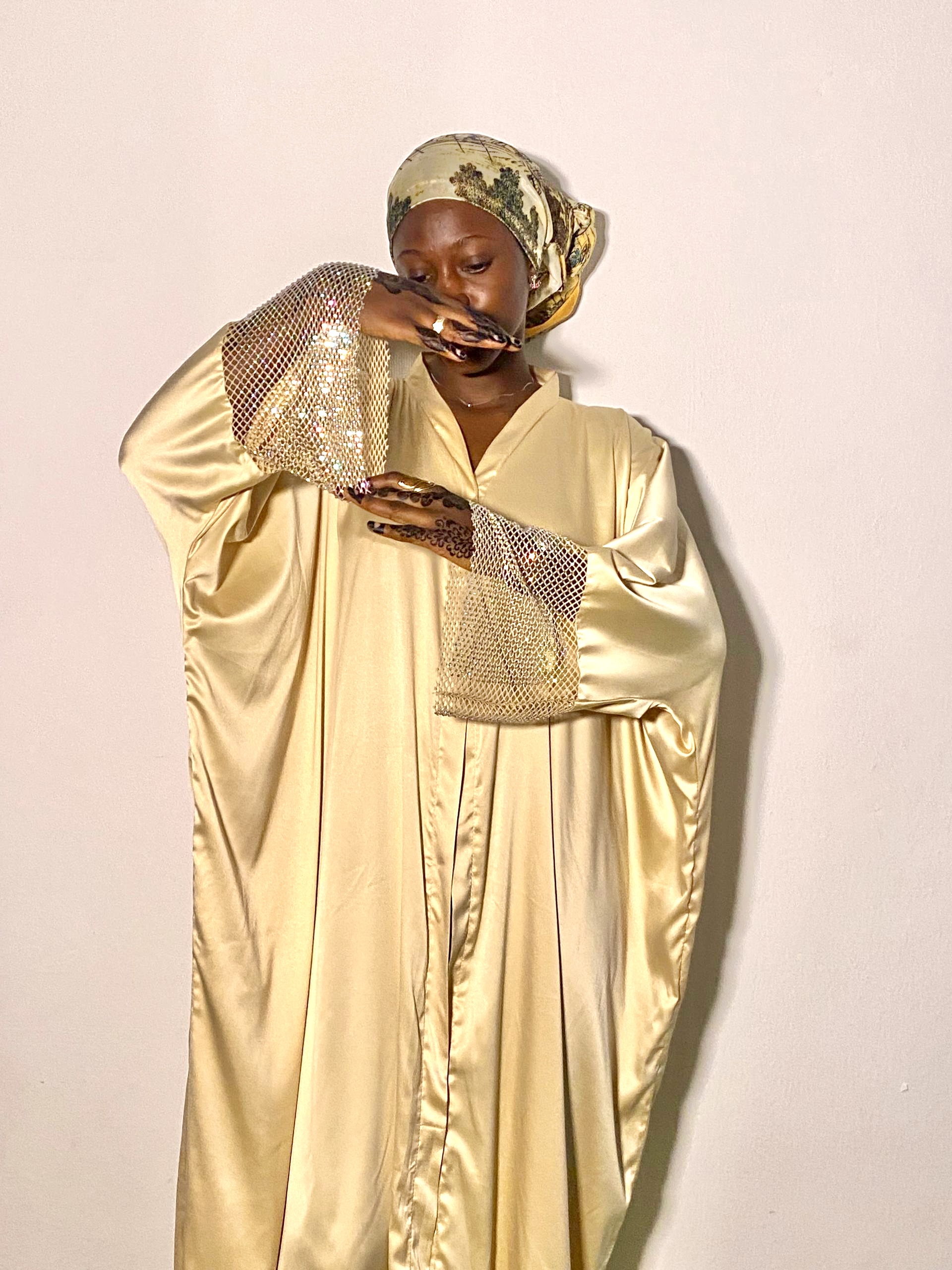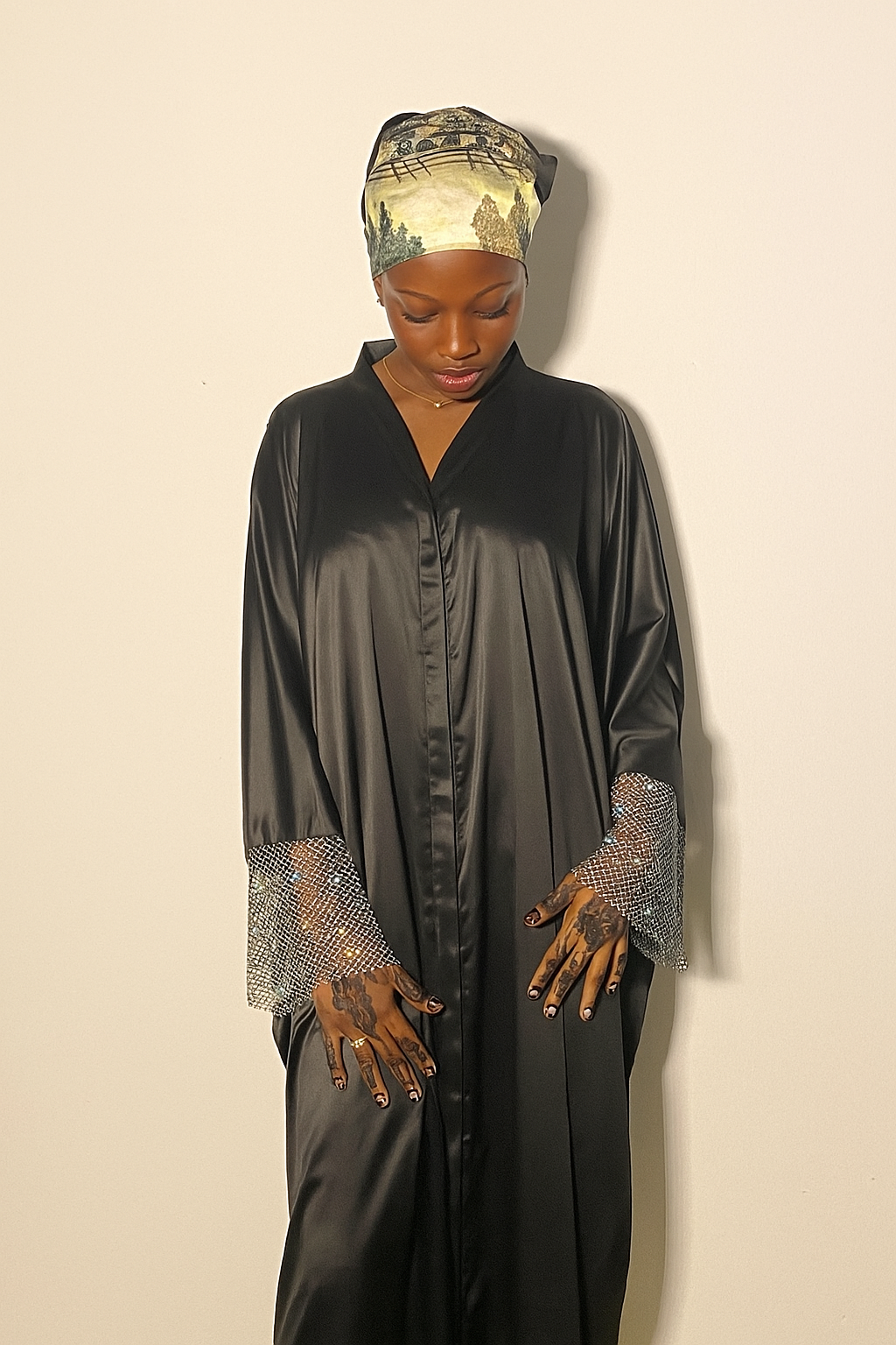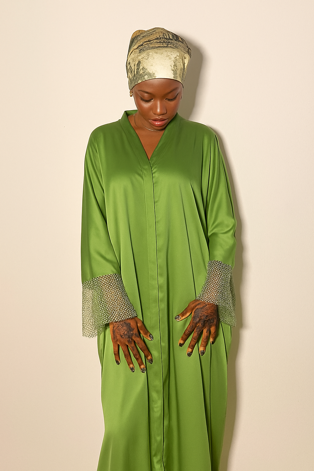A sleek boubou-like abaya with a minimalist feature of stoned net on the sleeve as the main attraction and size free silhouette giving beauty in simplicity. (Veil not included)