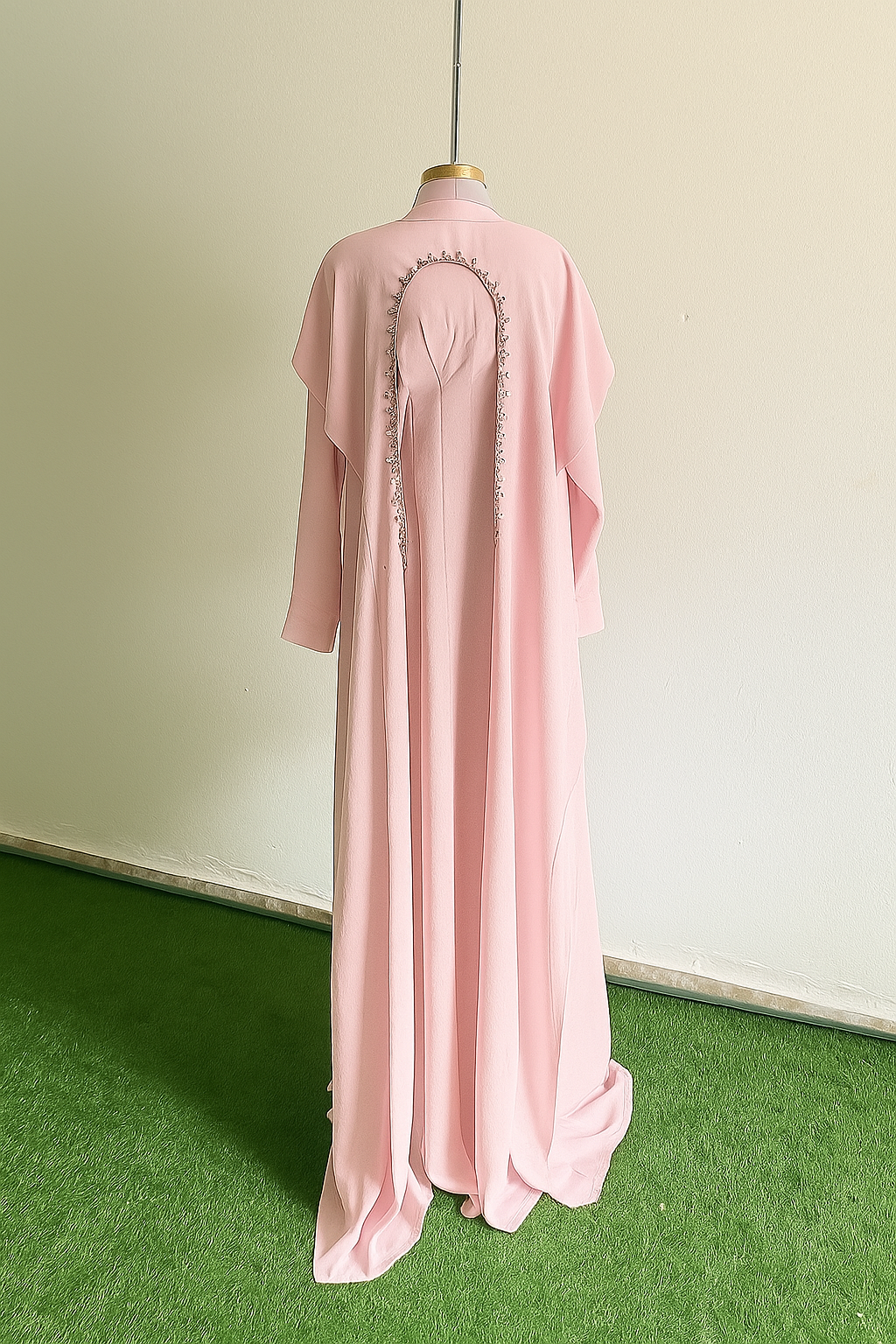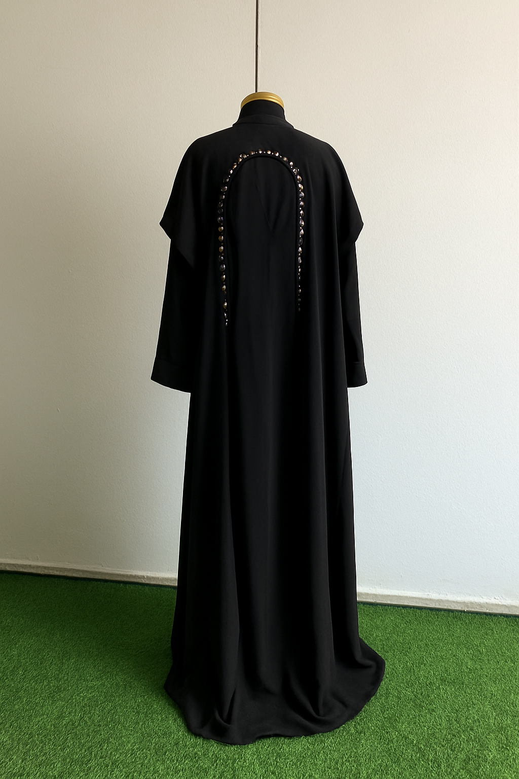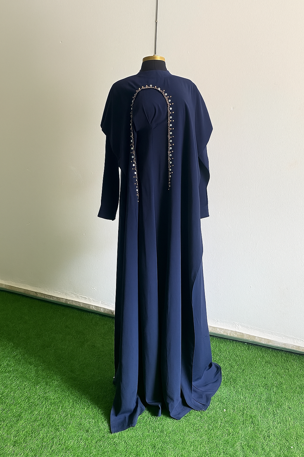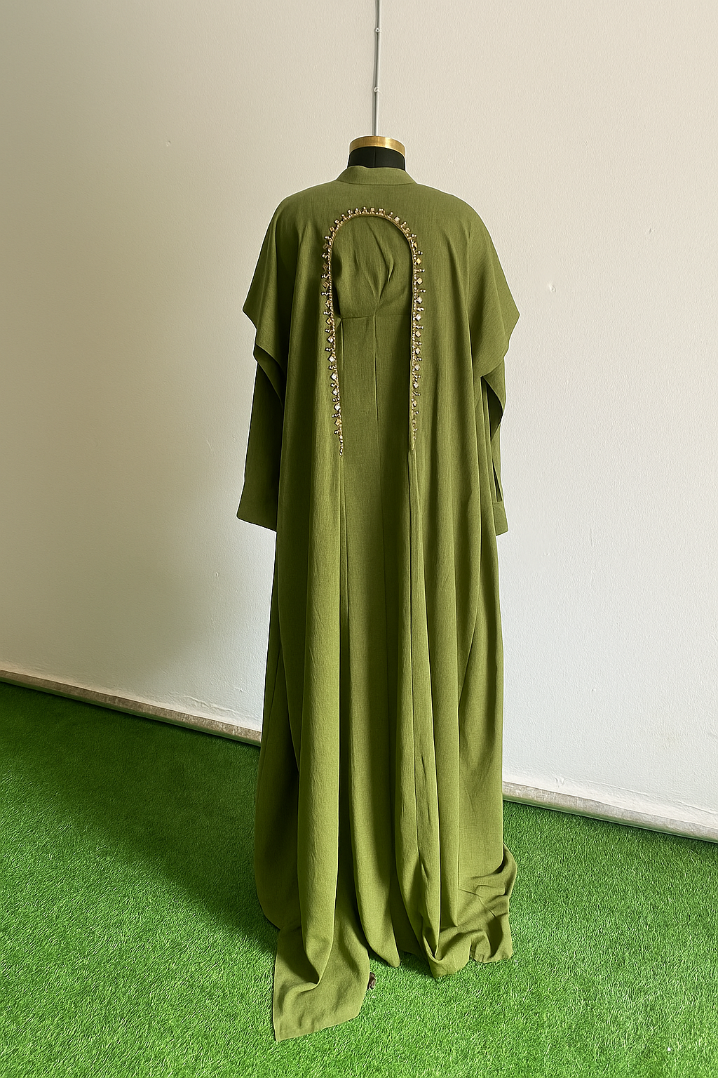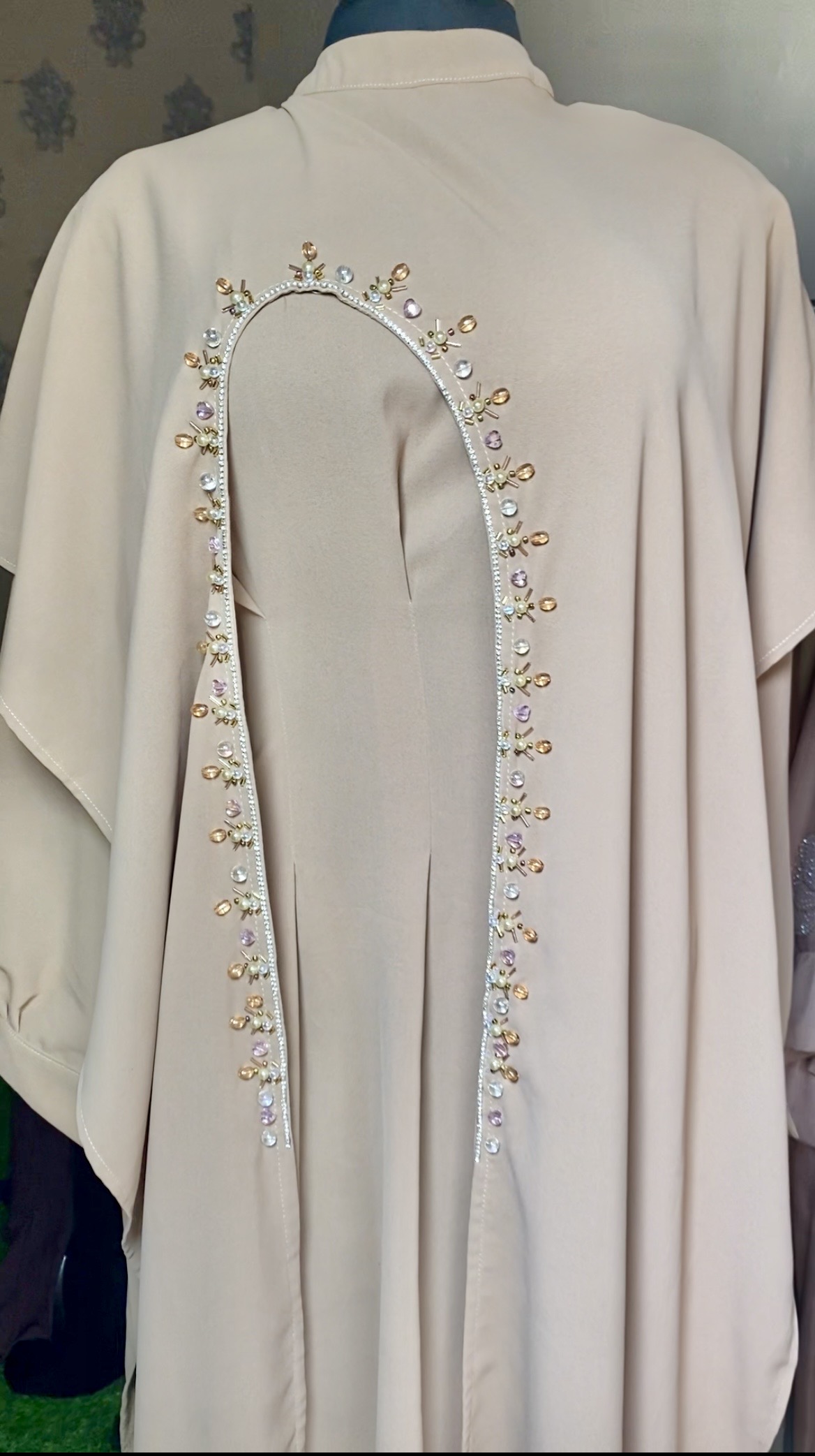 After dress as an armless collared size free opened view and complete opening from above chest area with embellishment trace halfway upwards that comprises a variety of multiple beads as an art
