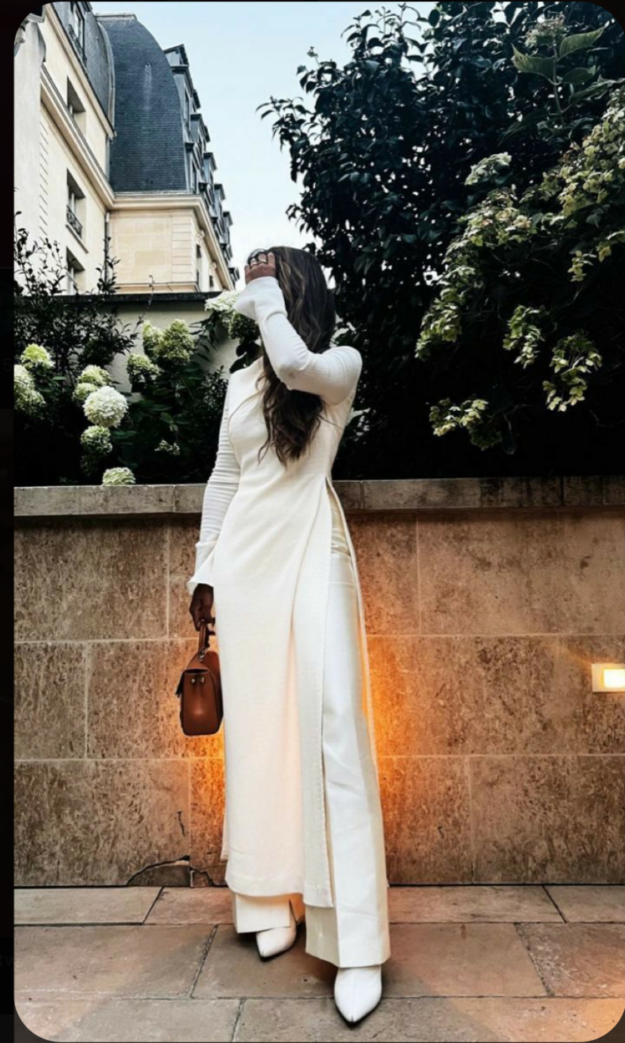 A smart wear featuring an open slit on the long shirt gown with straight long sleeves perfectly defined silhouette on the slightly fitted pants